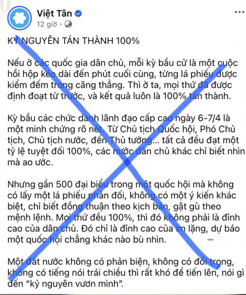 Với chiêu trò khoác áo “góc nhìn riêng”, “bình luận nhân sự”, “nhà quan sát chính trường Việt Nam”, “lăng kính chính trị”…, các đối tượng thù địch, phản động theo dõi sát diễn biến công tác nhân sự tại Kỳ họp thứ nhất, Quốc hội Khóa XVI để nhanh chóng tung ra các bài viết phê phán, đả kích, miệt thị nhằm vào cá nhân các đồng chí lãnh đạo Đảng, Nhà nước, đả kích chế độ. Lấy cớ việc Quốc hội tán thành tuyệt đối các chức danh nhân sự cấp cao, trang Việt Tân đăng bài đả kích “mọi thứ đều 100% thì đó không phải là đỉnh cao của dân chủ, đó là đỉnh cao của sự im lặng, dự báo một Quốc hội chẳng khác nào bù nhìn”; “một đất nước không có phản biện, không có đối trọng, không có tiếng nói trái chiều thì rất khó để tiến lên”! Té nước theo mưa, một số trang mạng xã hội của đối tượng chống phá lên bài mỉa mai rằng, việc trúng cử tuyệt đối là “chỉ dấu mất dân chủ, mất tự do”; đả kích việc bầu cử “chỉ là hình thức”, “diễn kịch”, “dân chúng mất lòng tin, không còn quan tâm”; “kết quả tuyệt đối không phải là đồng thuận dân chúng mà là sự chia chác nội bộ Đảng Cộng sản”…