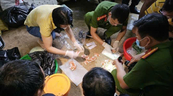 Qua khám xét, bên trong gói hàng là 5 hộp giấy “Mật ong nghệ đen Buôn Ma Thuột”, bên trong mỗi hộp giấy có 1 hộp nhựa chứa 20 gói nilon có dòng chữ Ferrari, tổng cộng 100 gói chứa bột khô. Theo kết luận giám định xác định đây là ma túy dạng “nước vui”, với khối lượng gần 0,5 kg ma túy dạng Ketamine, Nimetazepam, Methamphetamine và 2C-B. Quá trình điều tra làm rõ, Công an xác định, Lê Ngọc Hải quen biết xã hội với Nguyễn Văn Hải (SN 1995, trú xã Hưng Lộc, TP Huế) - là đối tượng thường xuyên qua Lào, có hoạt động mua bán ma túy. Lúc này, Lê Ngọc Hải đặt mua 100 gói nước vui với giá 170 triệu đồng, sau đó, Lê Ngọc Hải chuyển 120 triệu đồng và địa chỉ nhận hàng tại 33 Lý Thần Tông và số điện thoại để nhân viên chuyển phát liên lạc. Khi nhân viên chuyển phát đến nơi, gọi cho Lê Ngọc Hải thì Hải chỉ đạo Huỳnh Hồng Đợi ra nhận hàng thì cả hai bị lực lượng chức năng bắt quả tang.