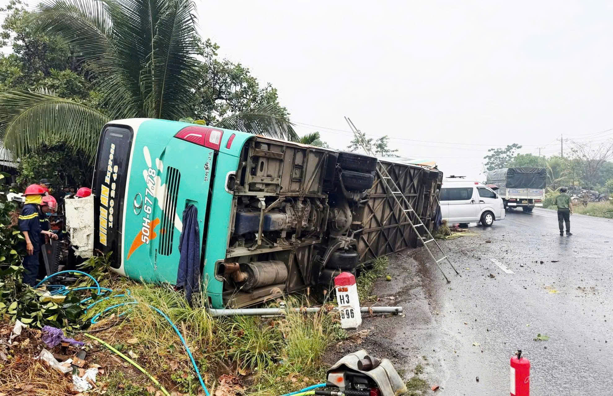 Hiện trường vụ lật xe khách trên quốc lộ 14 khiến 1 người chết và 2 người bị thương