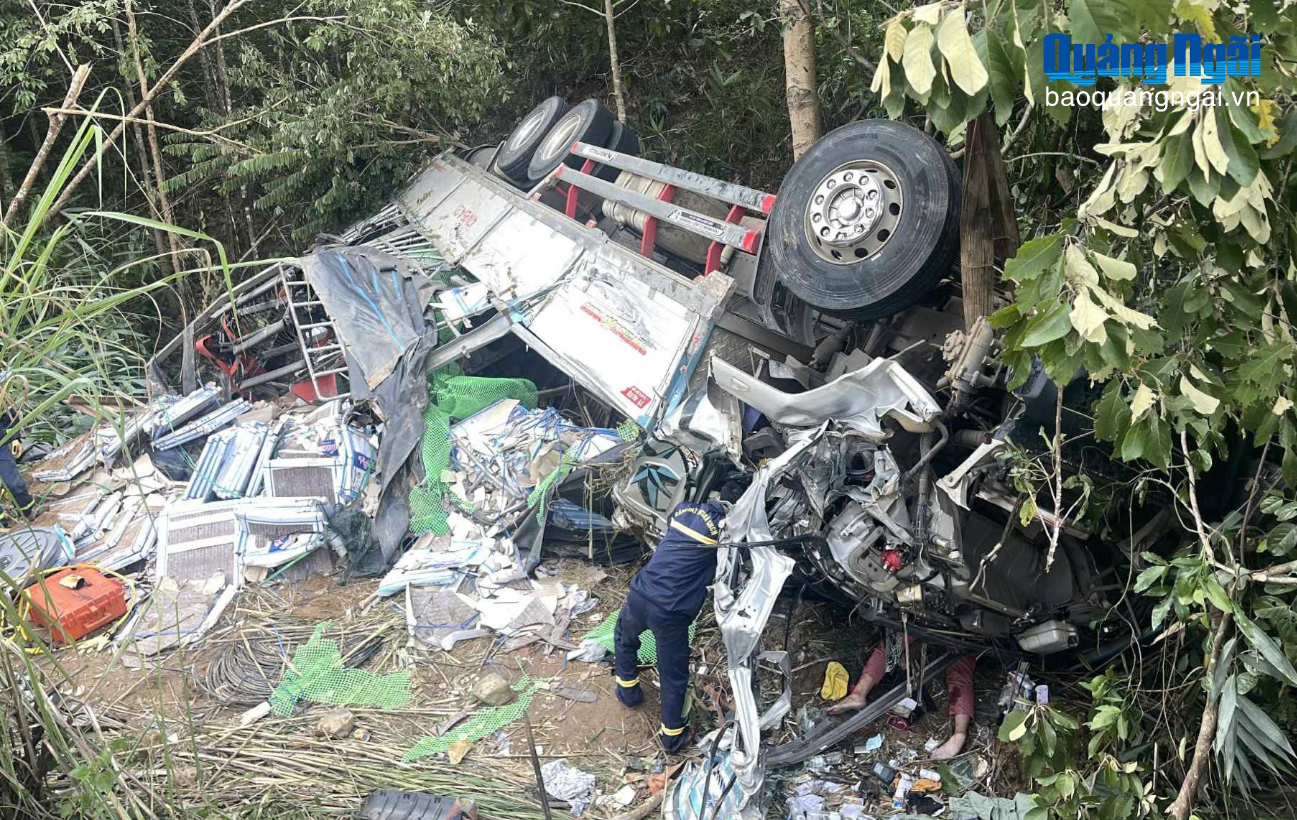 Xe tải lật nghiêng bên đường.