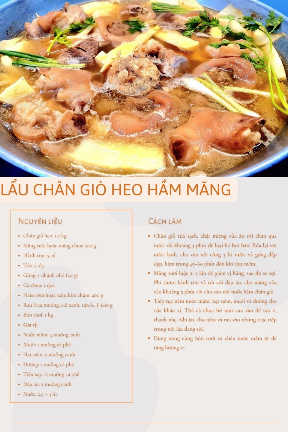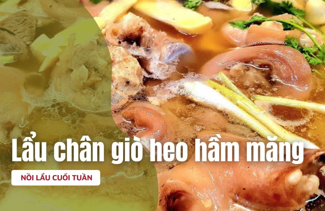Không quá cầu kỳ nhưng lại giàu hương vị, lẩu chân giò heo hầm măng là sự kết hợp hài hòa giữa vị béo, chua nhẹ và ngọt thanh. Một nồi lẩu nóng giữa bàn ăn không chỉ mang đến món ngon mà còn tạo nên không khí sum họp ấm áp cho buổi trưa cuối tuần.