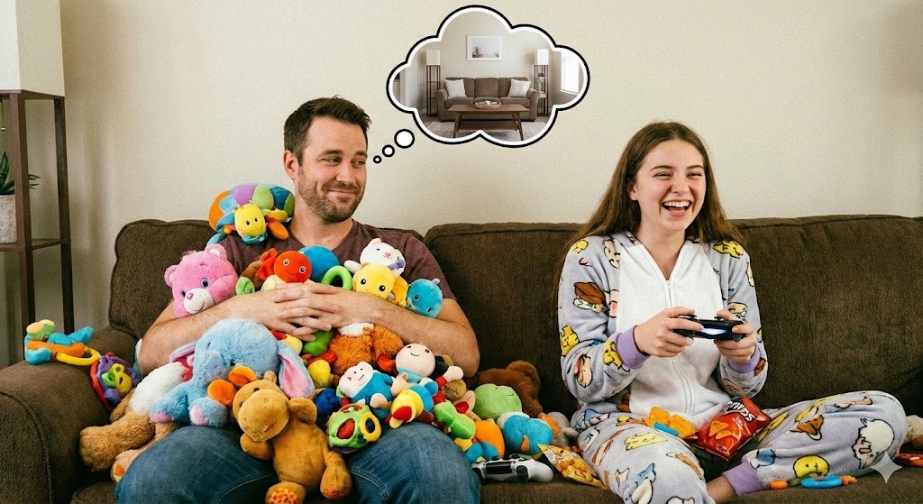 Nếu bạn bước vào phòng ngủ của vợ chồng tôi, bạn sẽ tưởng mình đi lạc vào nhà trẻ. Trên giường, thay vì những chiếc gối tựa sang trọng, là một tập đoàn thú bông đủ chủng loại: gấu, thỏ, lợn, và cả những con vật ngoài hành tinh mà tôi không biết tên.