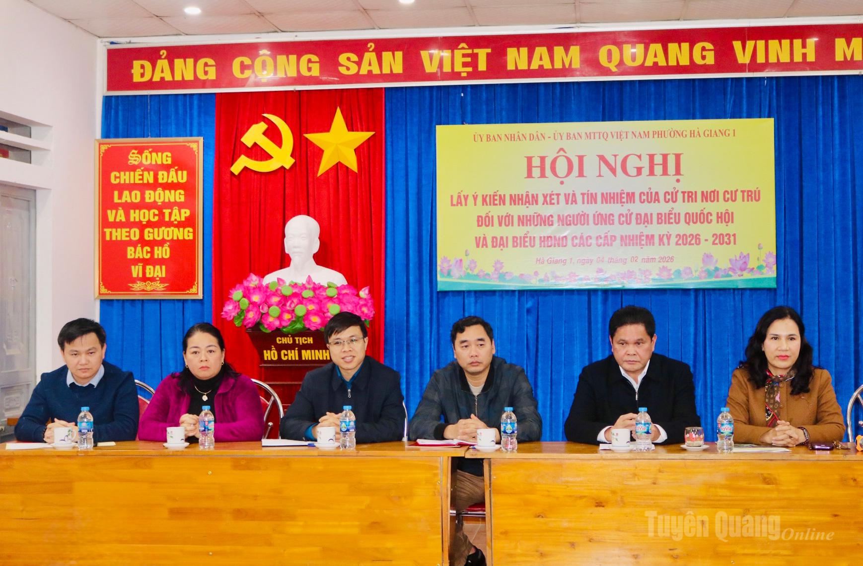 Tại Nhà văn hóa liên tổ 12+13+15 Minh Khai, Ủy ban MTTQ Việt Nam phường Hà Giang 2 tổ chức hội nghị lấy ý kiến nhận xét và tín nhiệm của cử tri nơi cư trú đối với người được giới thiệu ứng cử đại biểu Quốc hội (ĐBQH) khóa XVI và đại biểu HĐND các cấp, nhiệm kỳ 2026 – 2031. Dự hội nghị có các đồng chí Ủy viên Ban Thường vụ Tỉnh ủy: Trần Quang Minh, Trưởng Ban Tổ chức Tỉnh ủy; Lý Thị Lan, Trưởng đoàn ĐBQH hoạt động chuyên trách khóa XV tỉnh Tuyên Quang; cùng đông đảo cử tri các tổ dân phố 13 và 15 Minh Khai, phường Hà Giang 2.