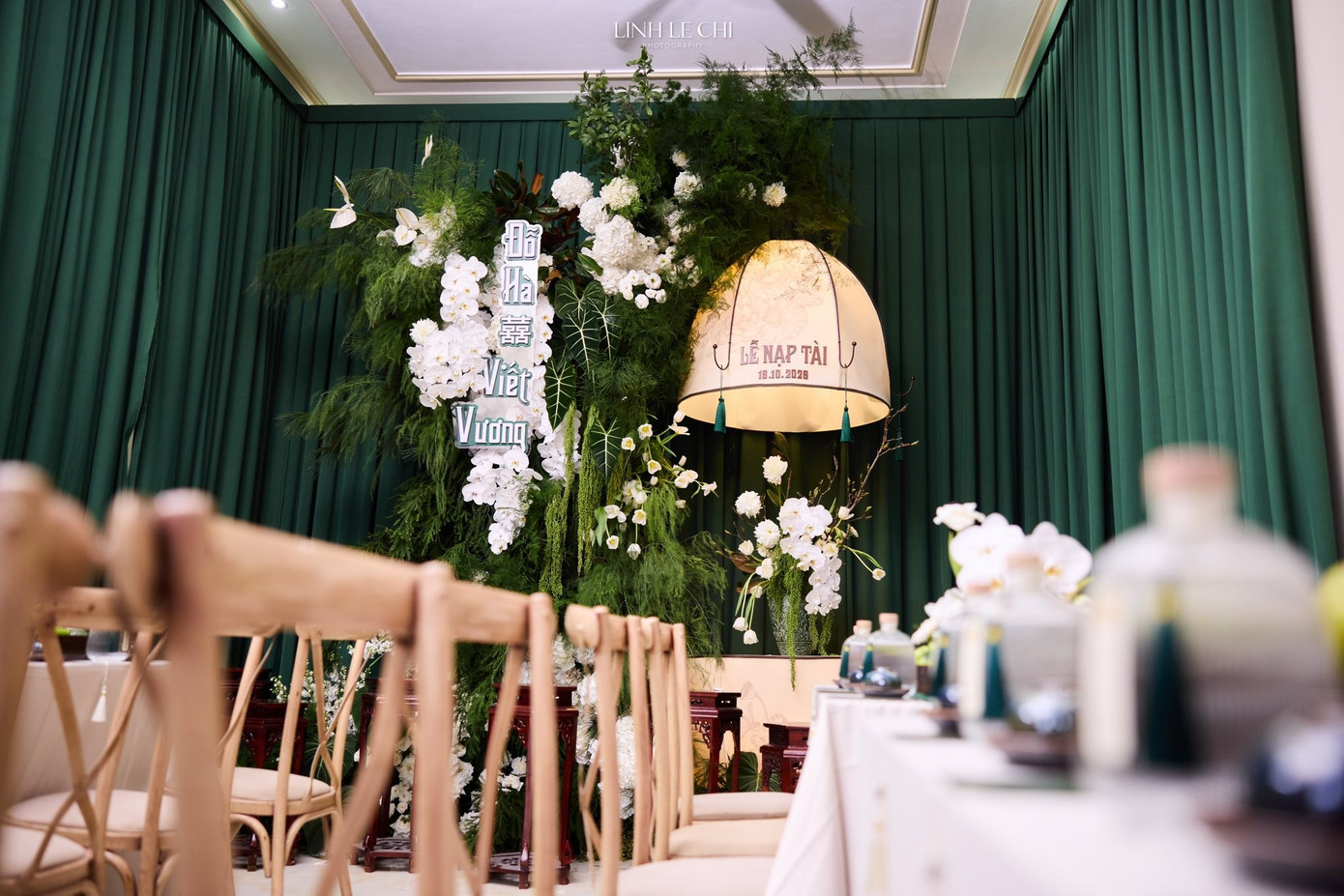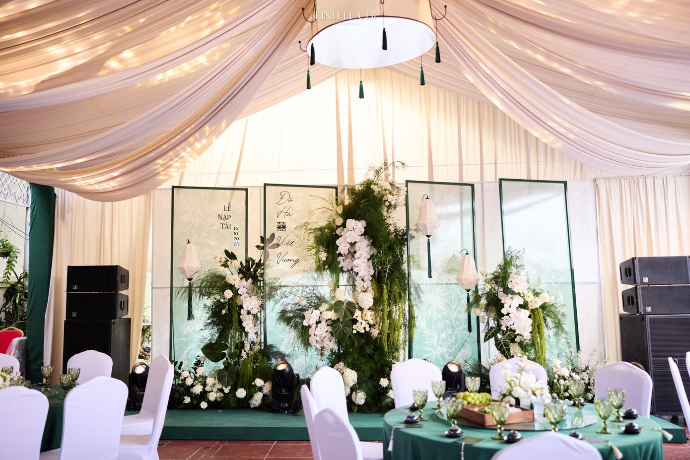 Hoa hậu Việt Nam 2020 chọn màu chủ đạo là xanh ngọc lục bảo cho phông nền, cây lá kết hợp với các loại hoa màu trắng như hoa lan, hoa cúc, hoa baby, cẩm tú cầu tạo nên không gian thanh nhã, nhẹ nhàng. Sự kết hợp màu sắc này lấy cảm hứng từ hoa lá và nước - biểu tượng của sự thanh khiết, tình yêu vĩnh cửu.