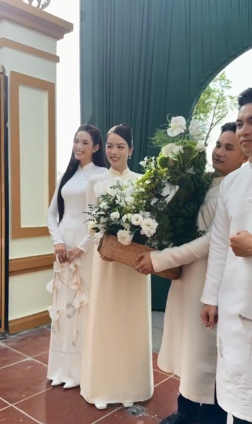 Dàn phù dâu cho Hoa hậu Đỗ Thị Hà cũng toàn mỹ nhân đình đám như Hoa hậu Thanh Thủy, Á hậu Ngọc Thảo, Hoa hậu Kiều Duy, Á hậu Minh Thư… Tất cả đều diện áo dài trắng thanh nhã, đồng điệu với cô dâu tạo nên cả "bầu trời visual".