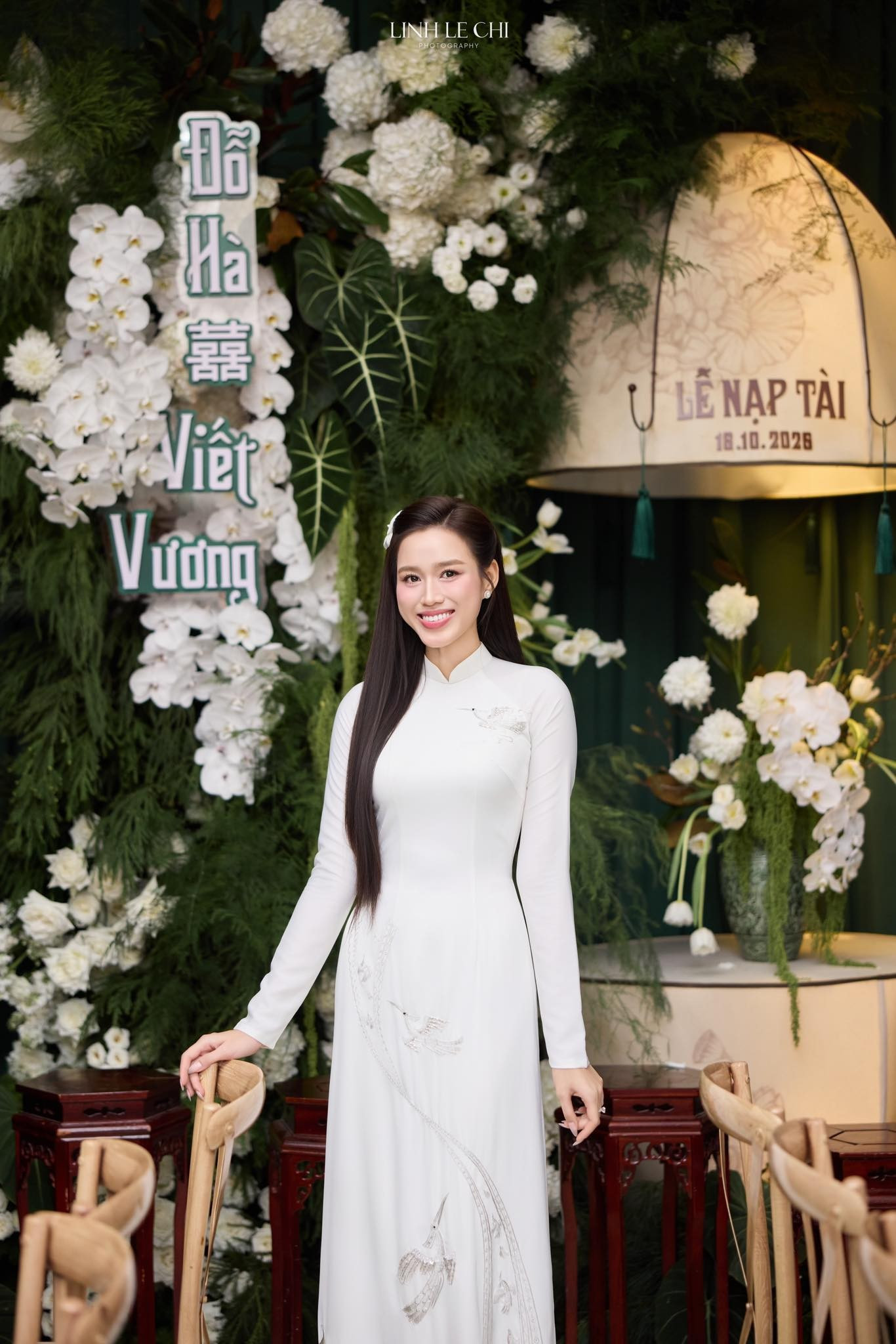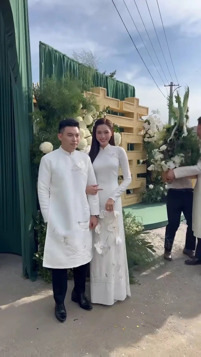 Vợ chồng Hoa hậu Đỗ Thị Hà đều chọn áo dài trắng hài hòa với tông màu chủ đạo của buổi lễ. Trang phục cưới của cô dâu chú rể được NTK Dũng Nguyễn lấy cảm hứng từ quê hương Thanh Hóa và Quảng Trị của hai vợ chồng.
