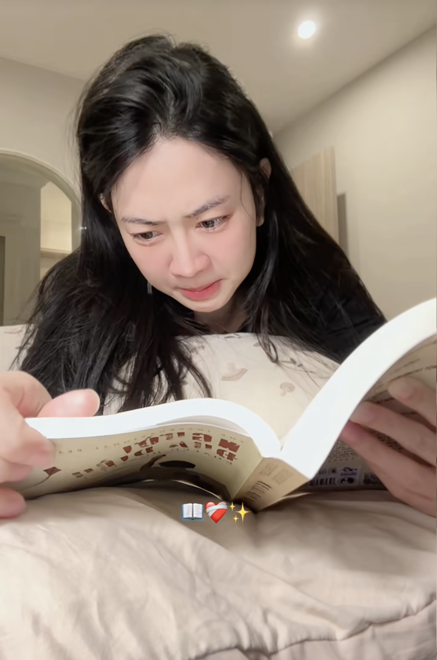 Lê Bống gây tranh cãi, bị đánh giá là "diễn xuất" khi đặt máy quay ghi lại cảnh vừa đọc sách vừa khóc. Ảnh: @lebong95.
