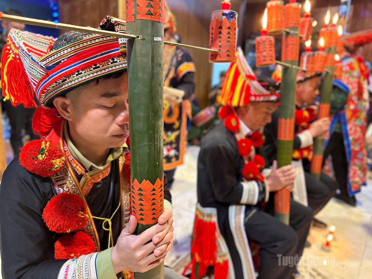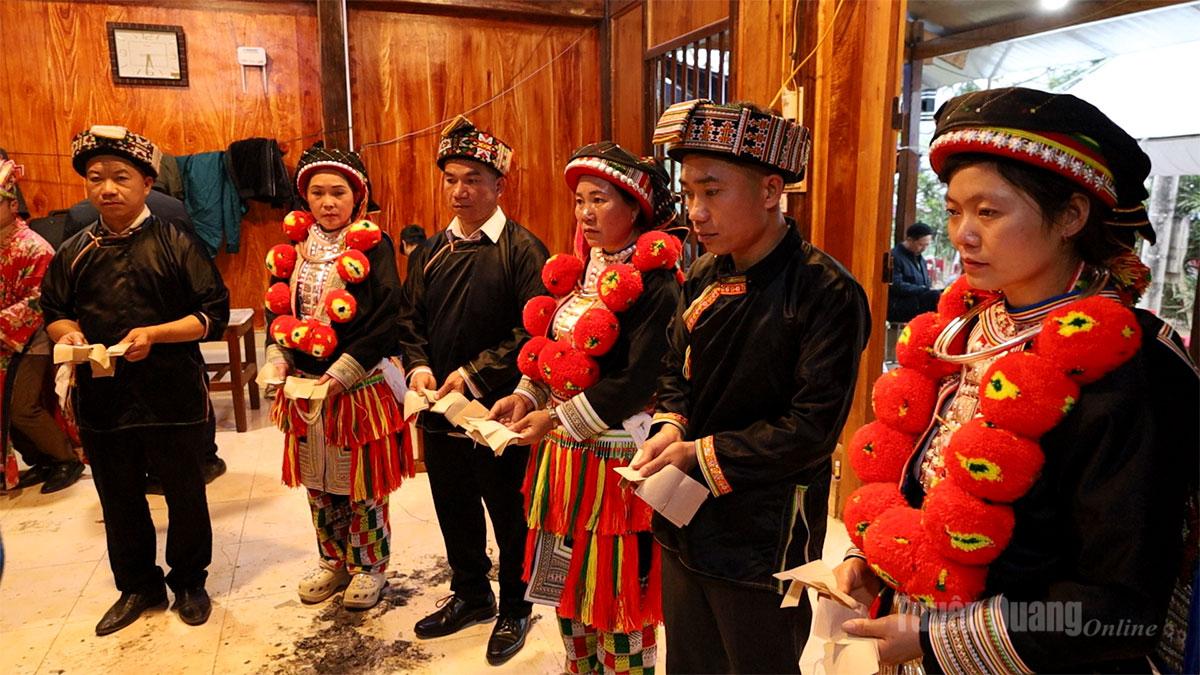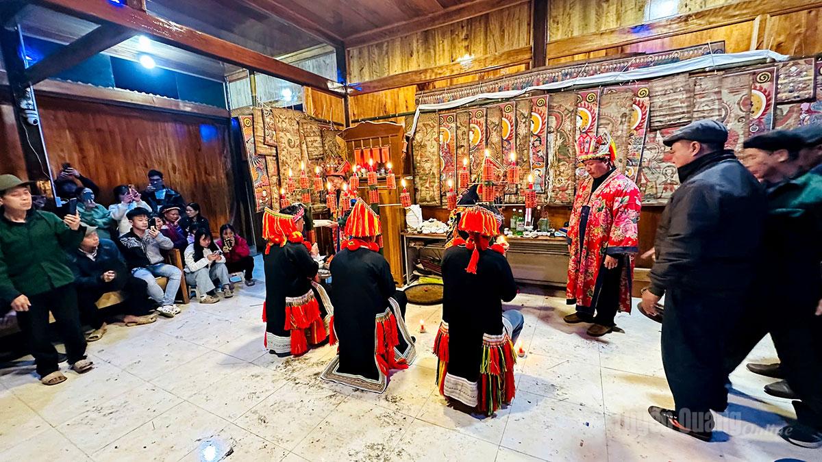 Các thầy cúng thực hiện nghi thức treo tên của những người đã được cấp sắc để báo cáo với tổ tiên và các vị thần.