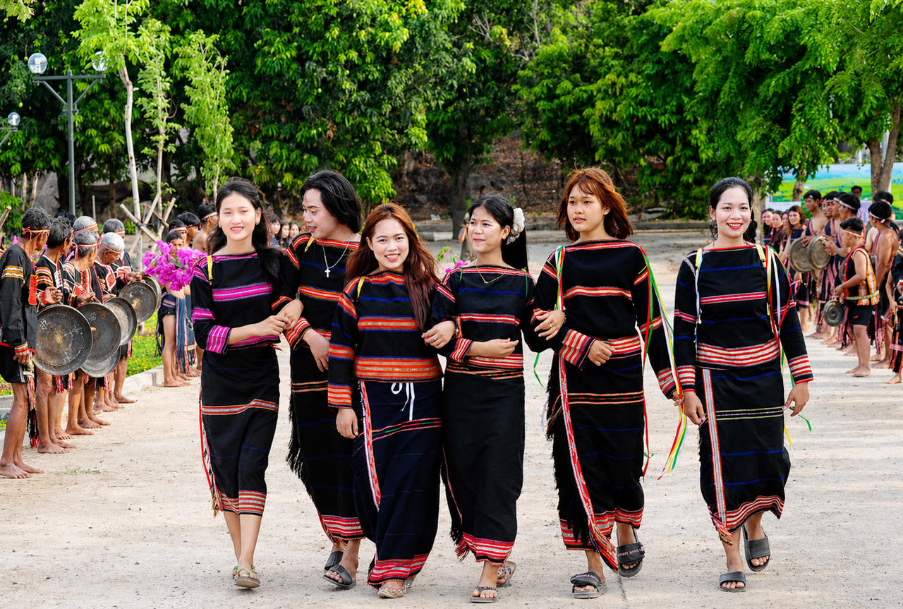 Những cô gái Gia Rai trong trang phục truyền thống nhanh chân đến vội bước cho kịp dự lễ hội.