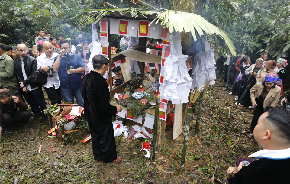 Thầy cúng thực hiện nghi lễ cúng thần rừng. (Ảnh: Tuấn Anh/TTXVN)