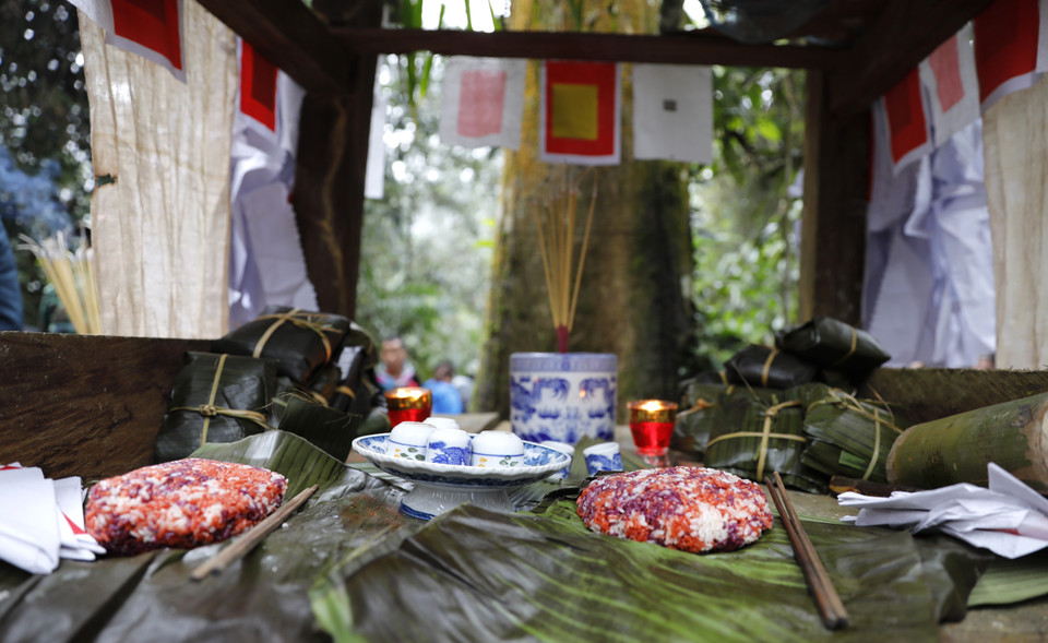 Mâm lễ được chuẩn bị để cúng thần rừng. (Ảnh: Tuấn Anh/TTXVN)