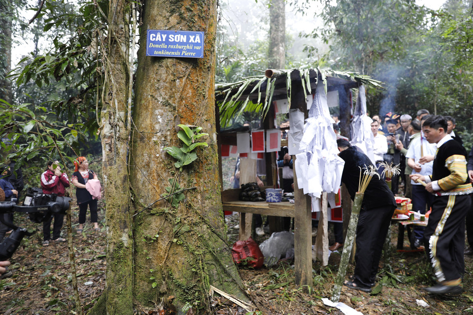 Nghi lễ cúng rừng được thực hiện dưới gốc cây cổ thụ. (Ảnh: Tuấn Anh/TTXVN)