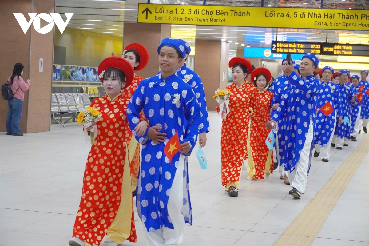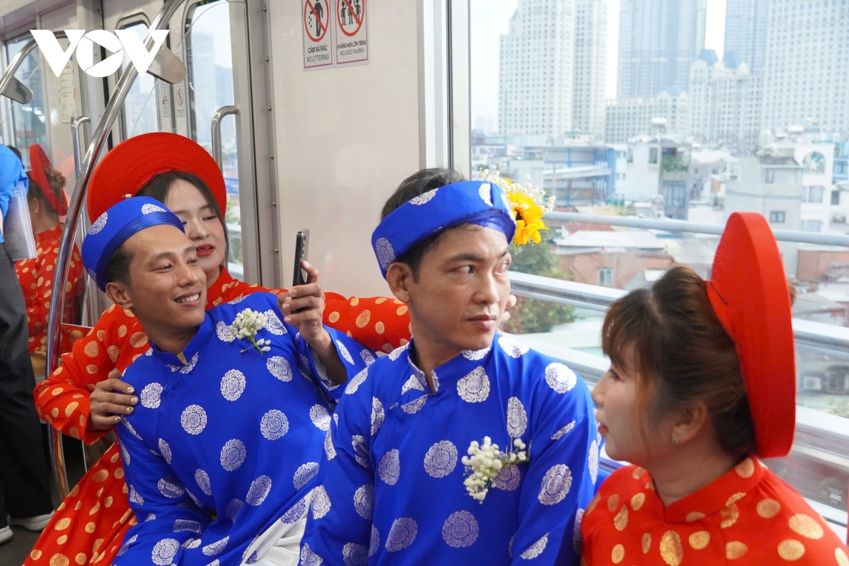 Các đôi vợ chồng trải nghiệm bằng tàu metro trên đường đến địa điểm làm lễ cưới