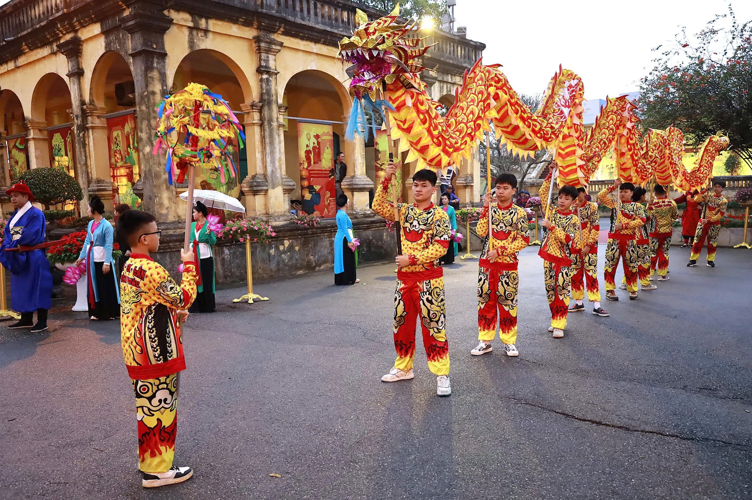 Sau phần nghi lễ trang trọng là không khí hội xuân tưng bừng, rộn rã với các hoạt động: Trống hội ba hồi chín tiếng, múa trống hội, rồng uốn lượn hai bên bậc thềm lên sân Rồng Điện Kính Thiên, múa cờ ngũ hành.