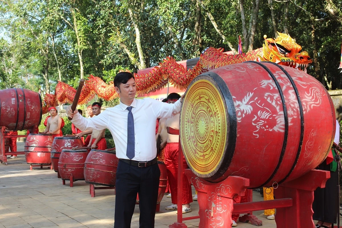 Đồng chí Lê Văn Trung, Tỉnh ủy viên, Giám đốc Sở Văn hóa, Thể thao và Du lịch đánh trống khai hội.