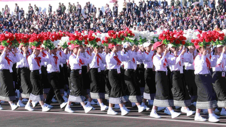 Khối cờ Đảng, cờ Tổ quốc Lào tham gia diễu hành. (Ảnh: TRỊNH DŨNG)