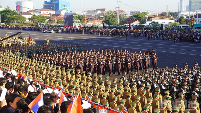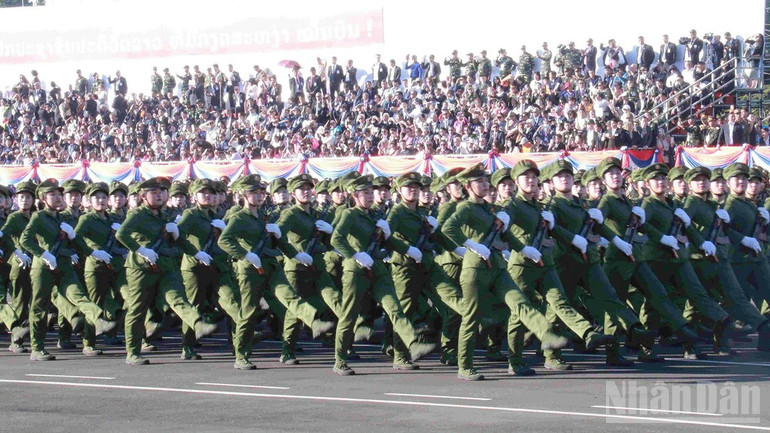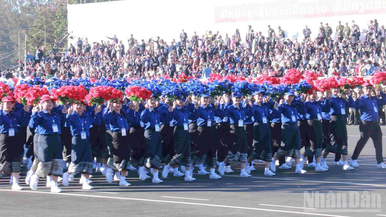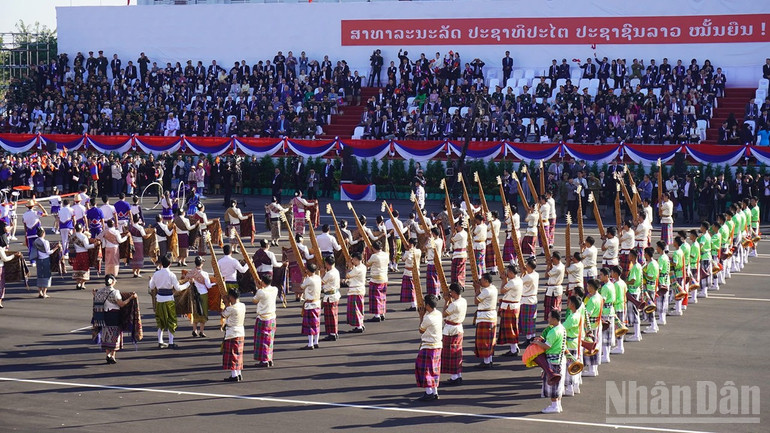 Sau màn khai mạc, lễ diễu binh, diễu hành của các lực lượng vũ trang, các ban, bộ, ngành, các tổ chức, đoàn thể chính trị-xã hội diễn ra trong không khí hào hùng, trang nghiêm, thể hiện sinh động những thành tựu trên mọi lĩnh vực đời sống, xã hội, kinh tế và quốc phòng mà Đảng, Nhà nước và nhân dân Lào đã giành được trong suốt 50 năm qua.