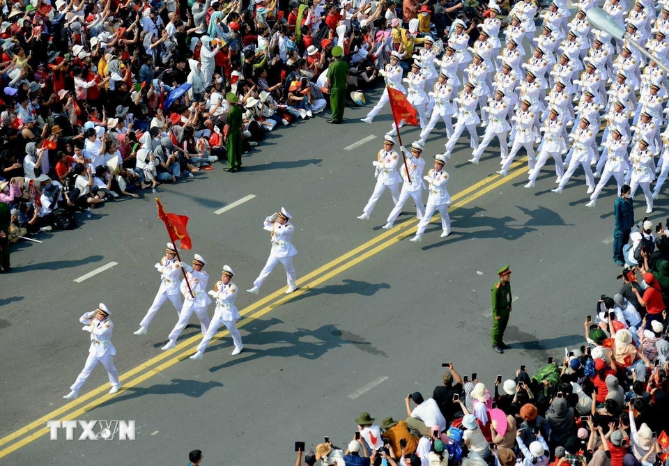 Khối Sỹ quan đại diện 5 cánh quân qua các cung đường thành phố Hồ Chí Minh. (Ảnh: TTXVN)