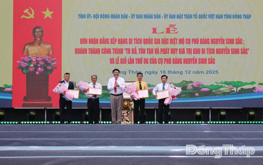 Chủ tịch Ủy ban nhân dân tỉnh Đồng Tháp Phạm Thành Ngại tặng Bằng khen và hoa cho đại diện tập thể có nhiều đóng góp trong tu bổ, tôn tạo Khu di tích Nguyễn Sinh Sắc.