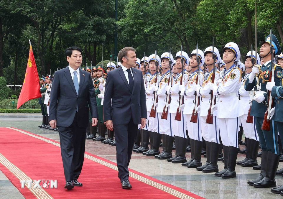 Chủ tịch nước Lương Cường và Tổng thống Pháp Emmanuel Macron duyệt Đội danh dự Quân đội Nhân dân Việt Nam. (Ảnh: Lâm Khánh/TTXVN)