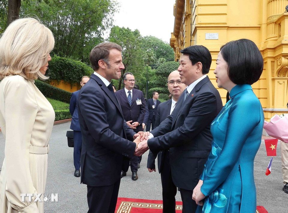 Chủ tịch nước Lương Cường và Phu nhân đón Tổng thống Pháp Emmanuel Macron và Phu nhân. (Ảnh: Lâm Khánh/TTXVN)