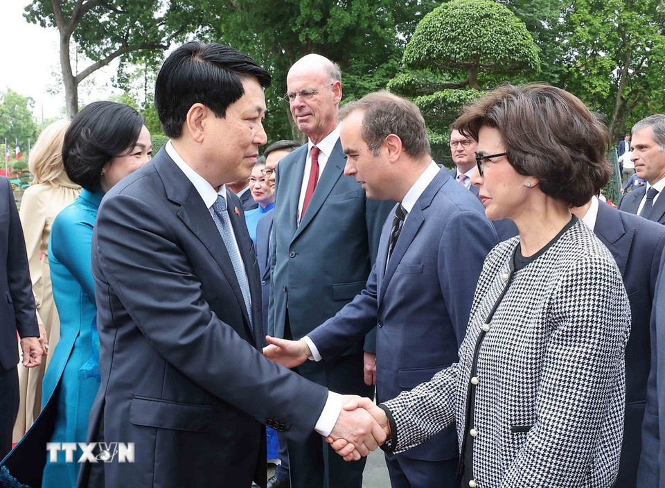 Chủ tịch nước Lương Cường và Phu nhân với các thành viên đoàn Pháp. (Ảnh: Lâm Khánh/TTXVN)