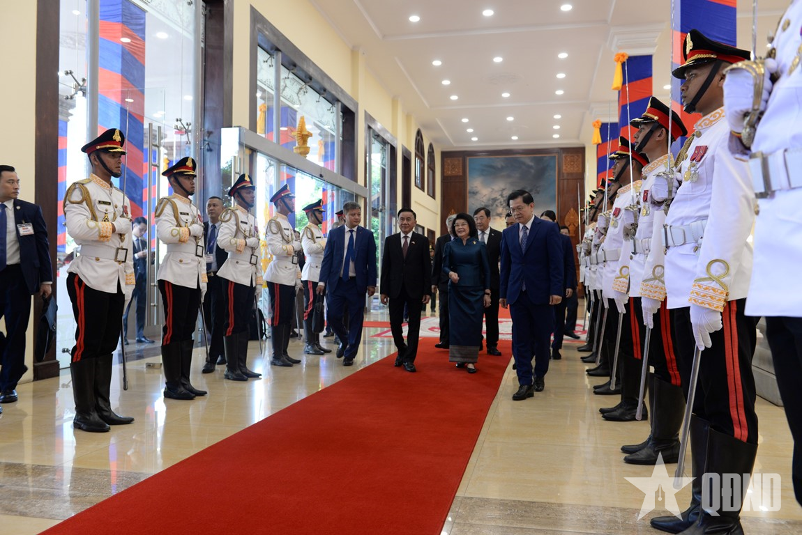 Chủ tịch Quốc hội Campuchia Khuon Sudary chủ trì Lễ đón đồng chí Trần Cẩm Tú, Ủy viên Bộ Chính trị, Thường trực Ban Bí thư Trung ương Đảng Cộng sản Việt Nam và Đoàn đại biểu cấp cao Việt Nam.
