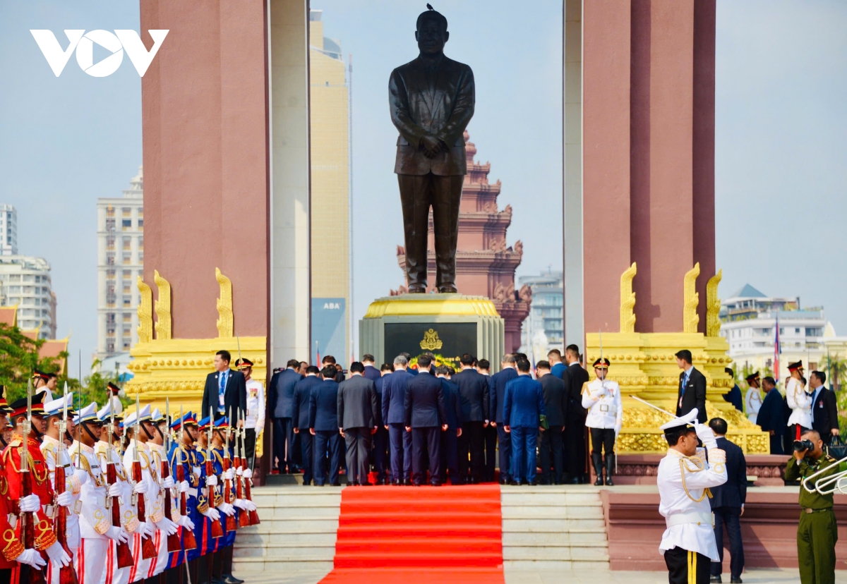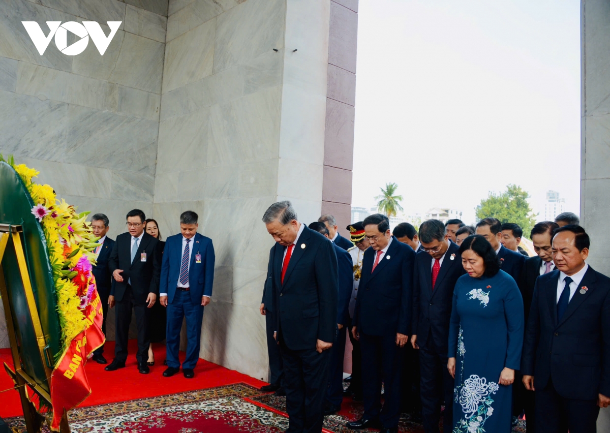 Sáng cùng ngày, Tổng Bí thư Tô Lâm cùng đoàn công tác đã tới đặt hoa tại Đài Độc lập, Tượng đài cố Quốc vương Norodom Sihanouk, Đài Hữu nghị Việt Nam - Campuchia ở Thủ đô Phnom Penh.