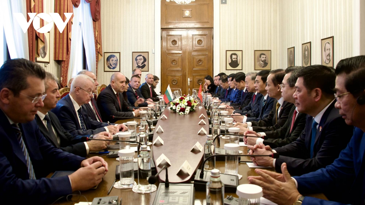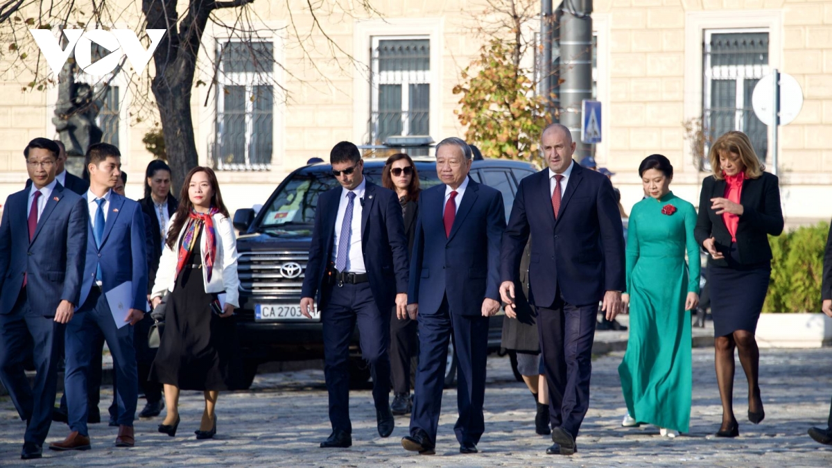 Tổng thống Bulgaria mời Tổng Bí thư Tô Lâm và Phu nhân di chuyển tới thảm đỏ, bước vào vị trí danh dự. Đội trưởng đội danh dự Bulgaria chào mừng Tổng Bí thư Tô Lâm và Phu nhân đến thăm Bulgaria. Trong không khí trang nghiêm, quân nhạc cử Quốc thiều Việt Nam và Bulgaria.