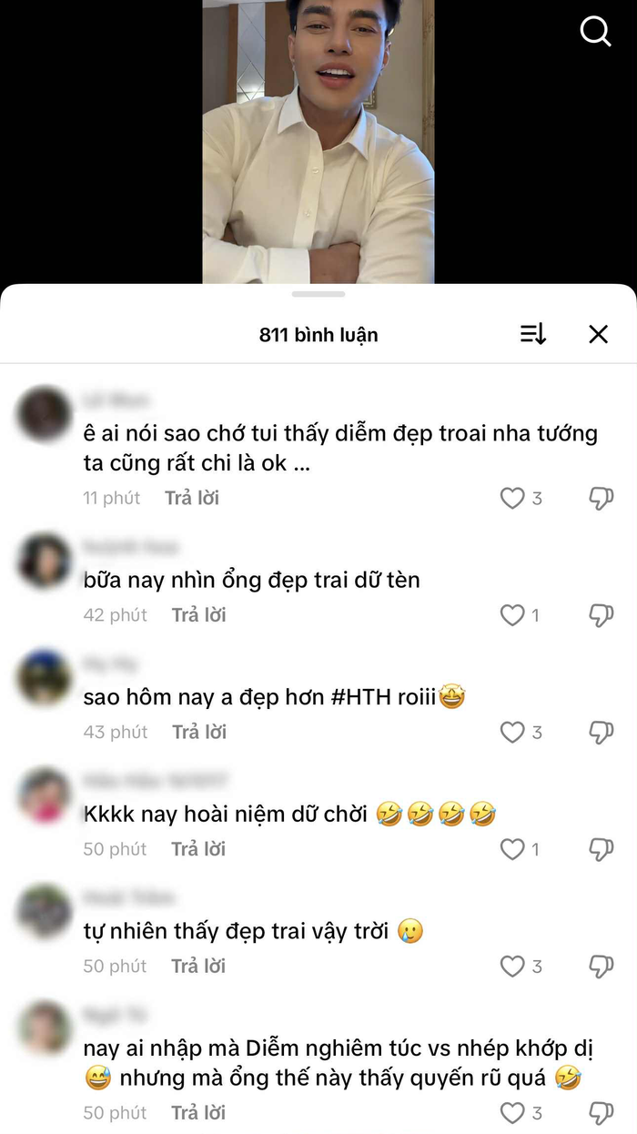 Bên dưới phần bình luận, khán giả liên tục bày tỏ sự bất ngờ trước diện mạo khác lạ của nam diễn viên. Nhiều người hài hước bình luận: "Tự nhiên thấy anh đẹp trai vậy trời" hay "Hôm nay sao mà nghiêm túc dữ vậy, thấy quyến rũ quá". Một tài khoản khác trêu: "Bữa nay nhìn ông đẹp trai dữ tợn, chắc có chuyện vui rồi đây".