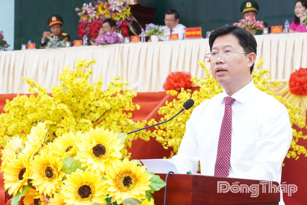 Nổi trống mở hội giao quân và phát biểu động viên công dân nhập ngũ, đồng chí Huỳnh Minh Tuấn, Tỉnh ủy viên, Phó Chủ tịch UBND tỉnh Đồng Tháp ghi nhận và biểu dương toàn thể các thanh niên đã chấp hành nghiêm Lệnh gọi nhập ngũ, bảo đảm quân số và chấp hành thời gian quy định, phấn khởi tham gia Ngày hội tòng quân hôm nay.