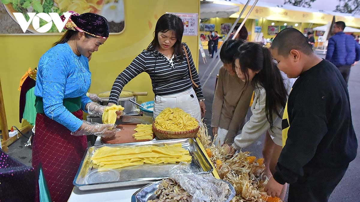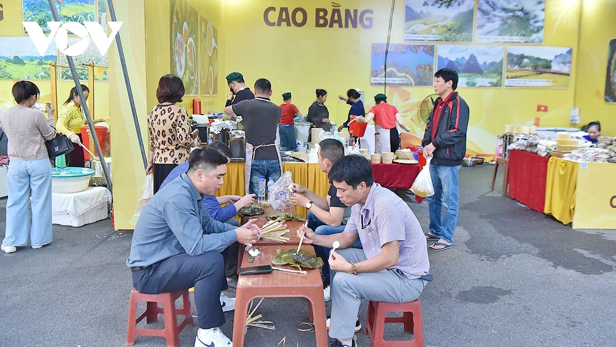 Thực khách thưởng thức đặc sản bánh chưng đen tại gian hàng ẩm thực Cao Bằng.
