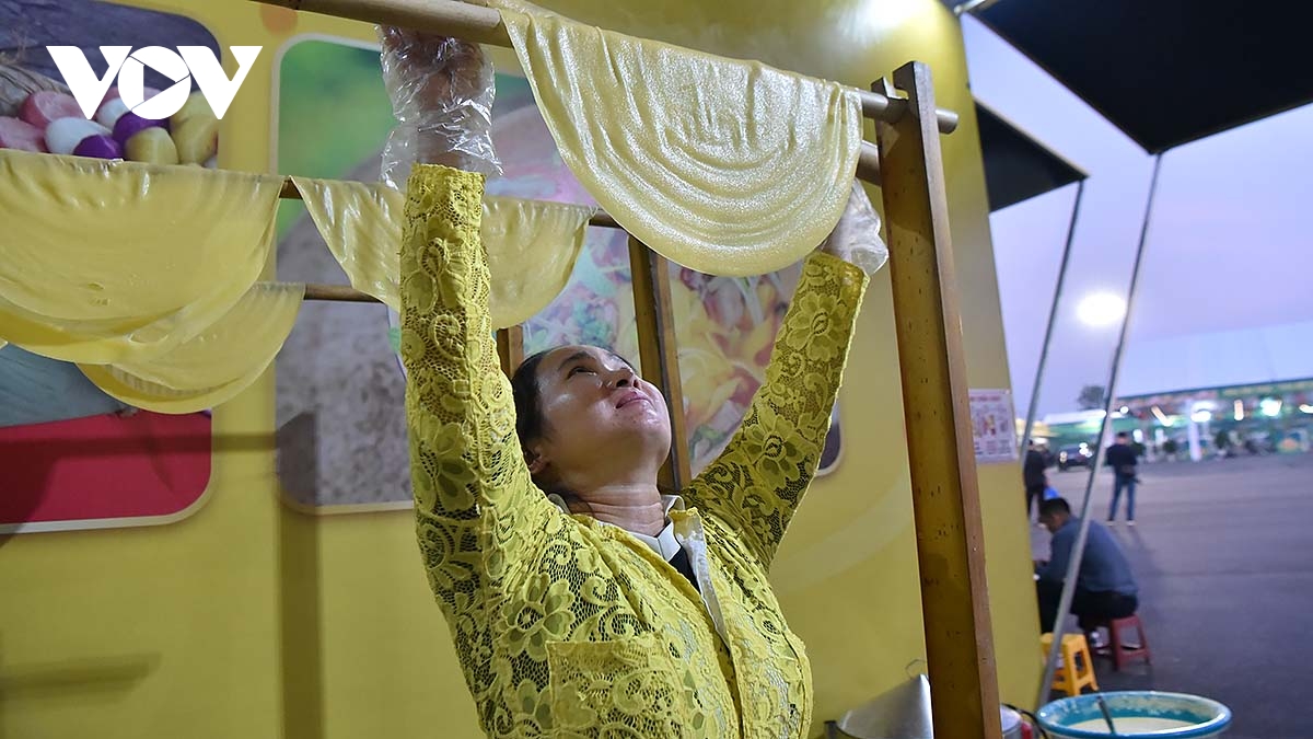 Tráng bánh phở ngô của Mông Village tại gian hàng ẩm thực Tuyên Quang.