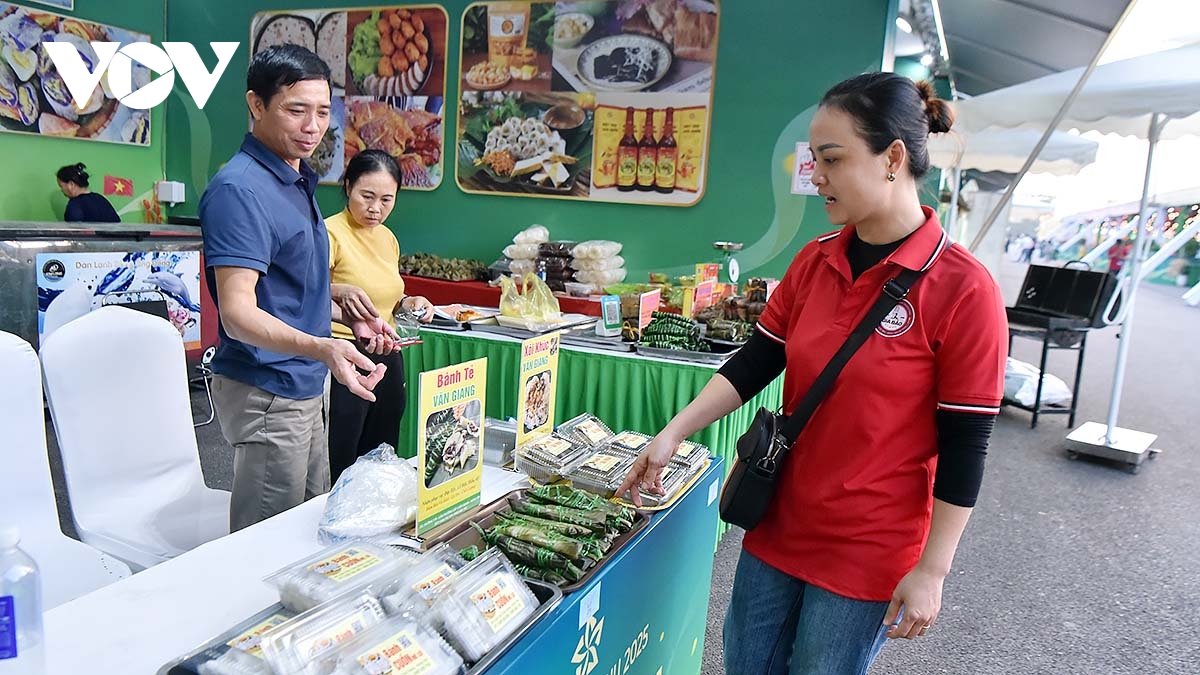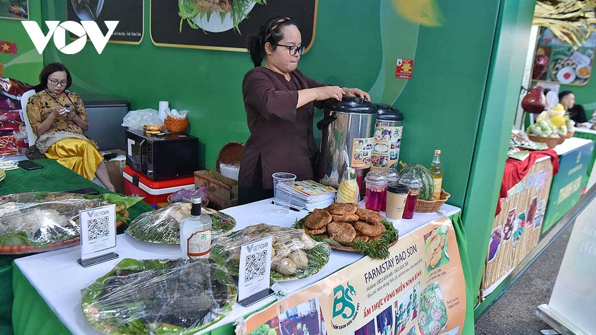 Gian hàng ẩm thực Hưng Yên giới thiệu nhiều món ăn dân dã như món bánh cuốn, bánh tẻ, xôi khúc...