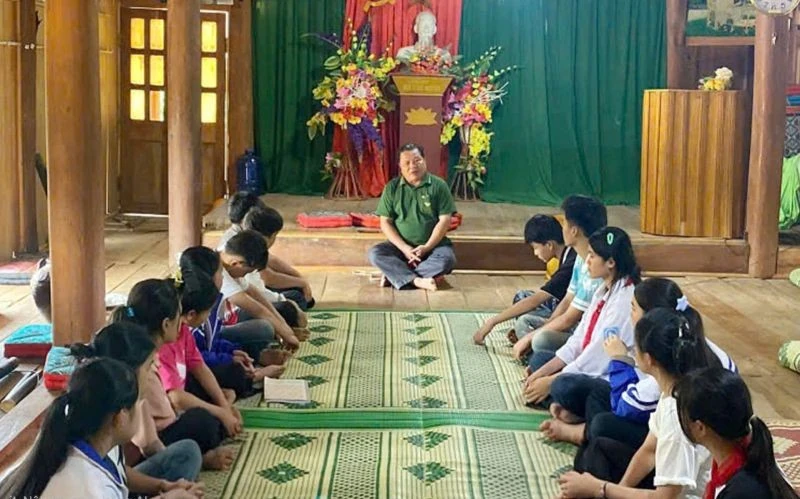 Nghệ nhân Lò Viết Lâm chia sẻ về lễ hội Chá Mùn cho các cháu học sinh.