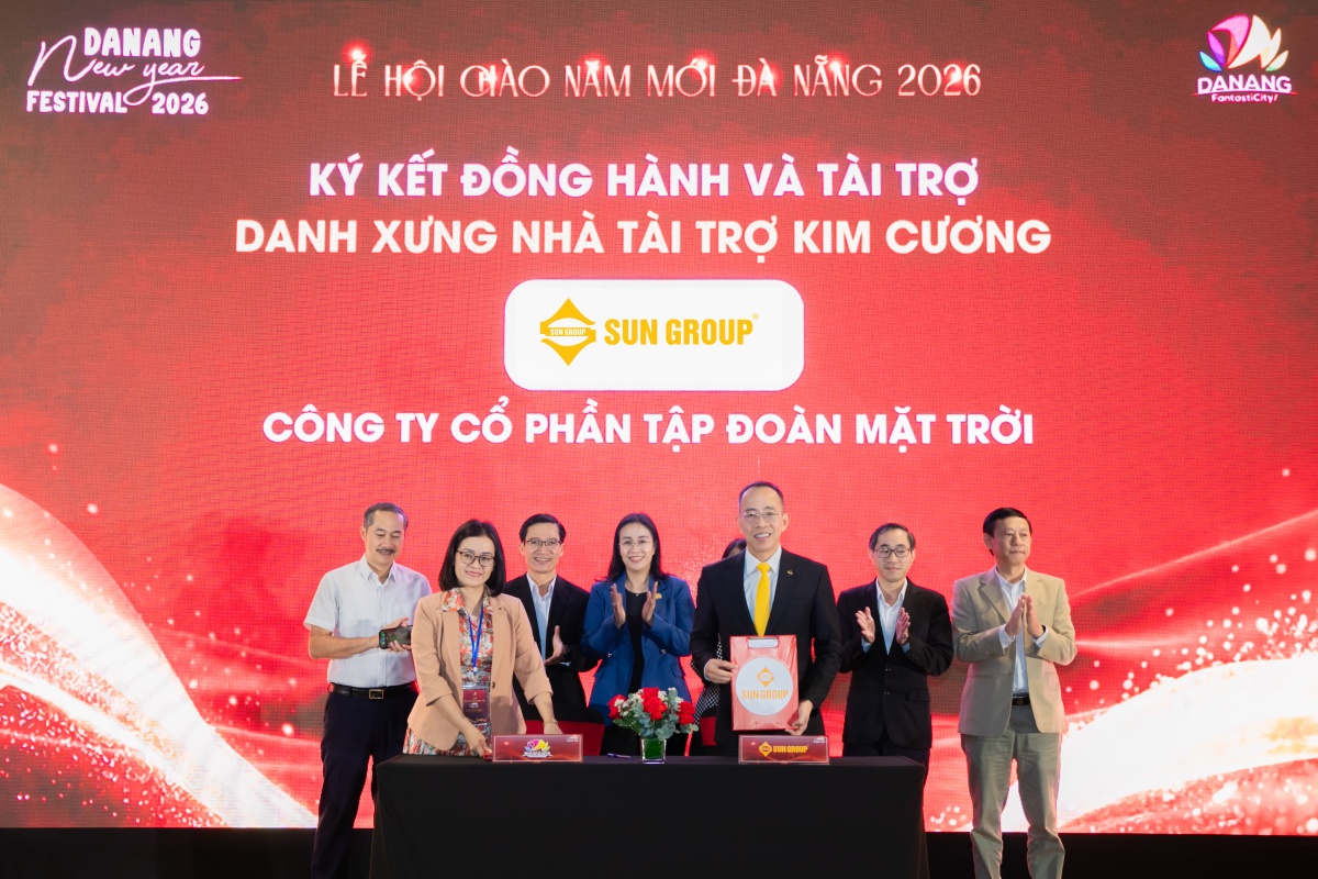 Bà Nguyễn Thị Anh Thi, Phó chủ tịch UBND TP Đà Nẵng ( giữa) chứng kiến ký kết tài trợ cho lễ hội giữa Tập đoàn Sungroup và ban tổ chức lễ hội.