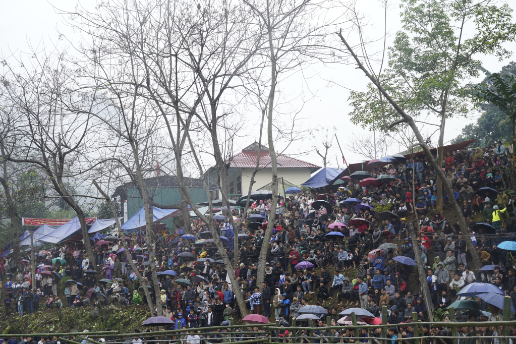 Trên các gốc cây, bụi chuối và những điểm cao quanh bãi chọi, người dân chọn cho mình vị trí thuận lợi, háo hức xem những cặp bò thi đấu.