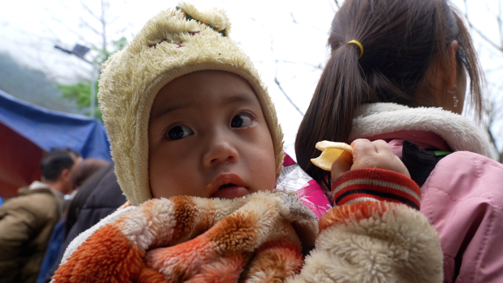 Trên lưng mẹ chăm chú theo dõi trận đấu.