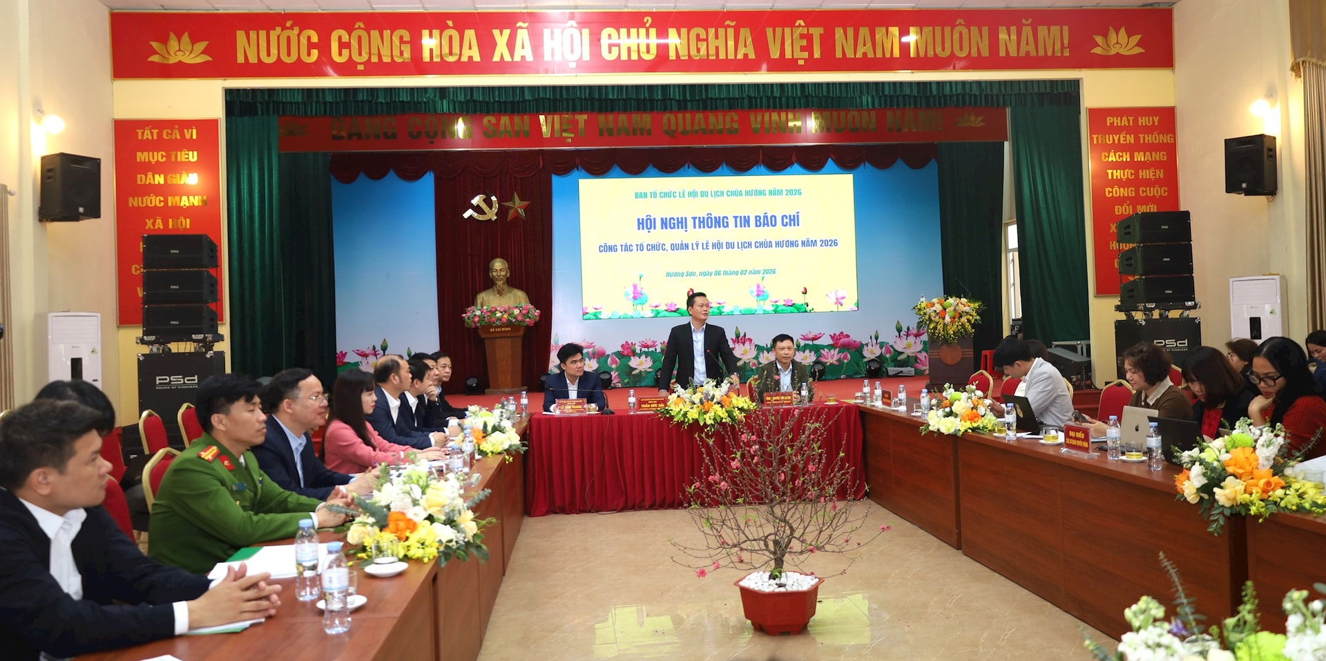 Sáng 6-2, Ban Tổ chức Lễ hội du lịch chùa Hương năm 2026 (xã Hương Sơn) tổ chức Hội nghị thông tin về công tác tổ chức, quản lý Lễ hội du lịch chùa Hương năm 2026. Ảnh: Kim Nhuệ