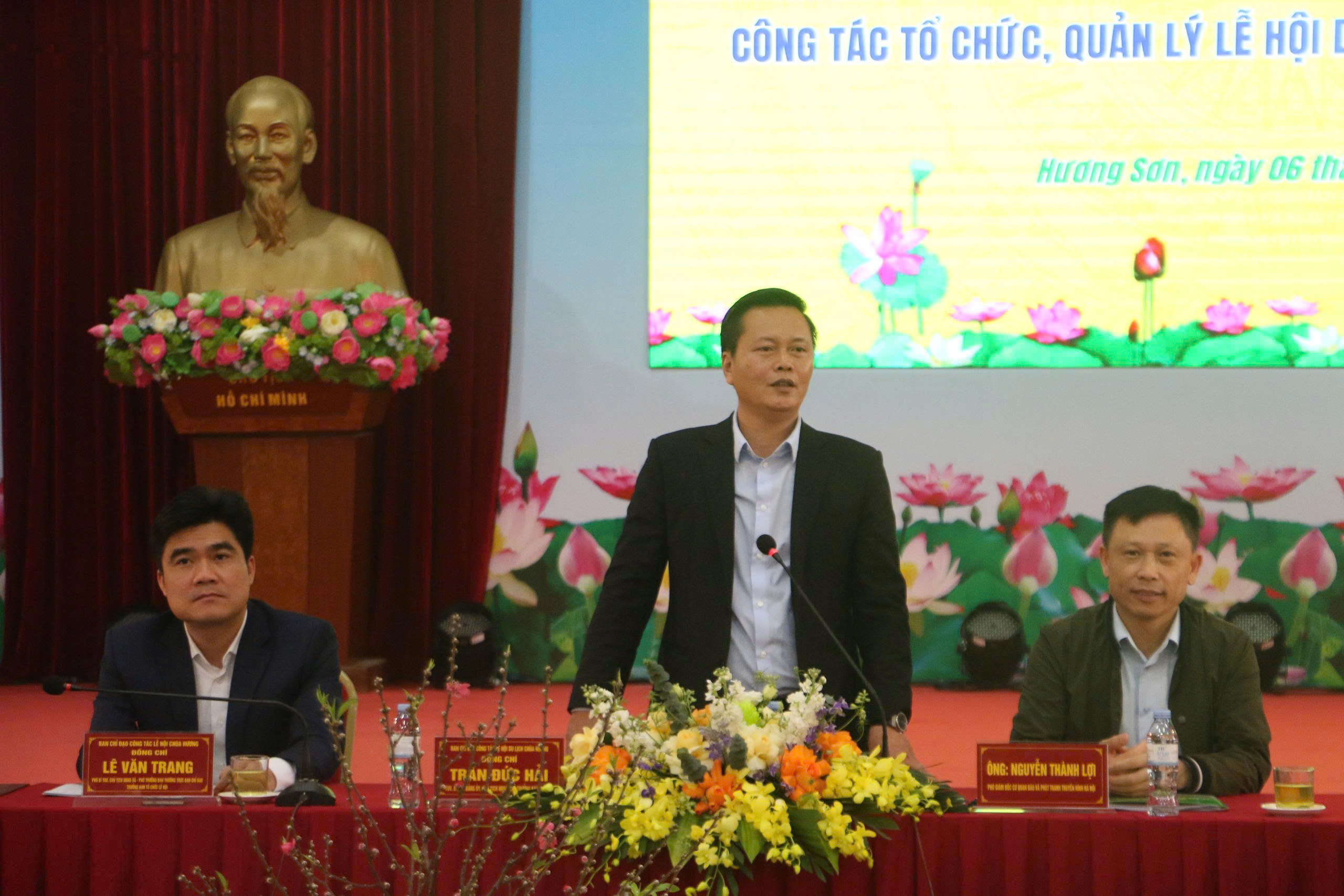 Ông Trần Đức Hải, Bí thư Đảng ủy xã Hương Sơn (Hà Nội), Trưởng ban chỉ đạo lễ hội Chùa Hương, thông tin với báo chí.