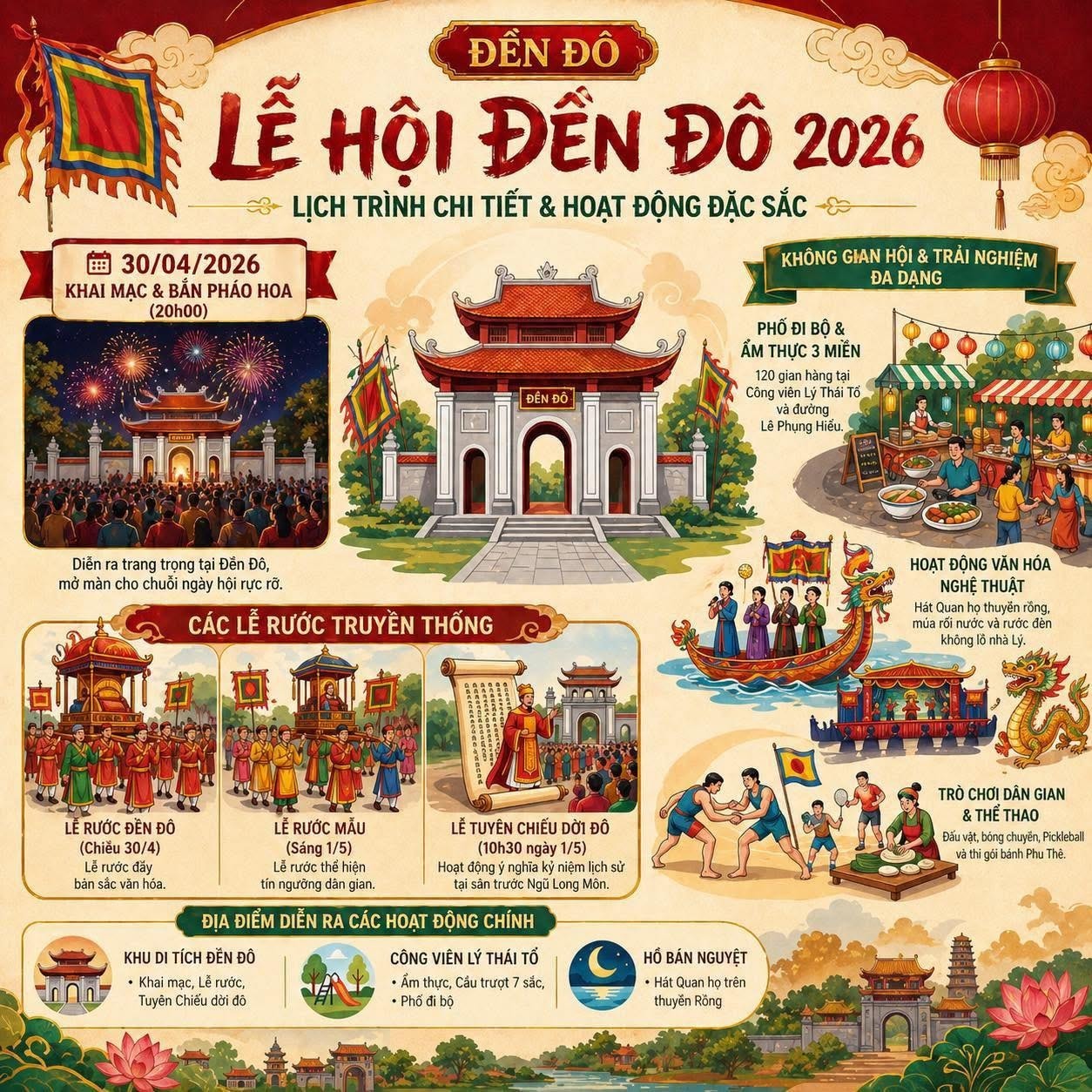 Theo Ban Tổ chức, Lễ hội sẽ diễn ra từ ngày 30/4 - 2/5/2026 tại Khu di tích quốc gia đặc biệt Đền Đô. Lễ hội năm nay cũng đánh dấu bước chuyển đáng chú ý trong cách tổ chức khi mở rộng không gian ra khu vực trung tâm phường Từ Sơn. Không chỉ dừng lại ở các nghi lễ truyền thống như rước kiệu, dâng hương, tế lễ, Ban tổ chức còn khai thác mạnh phần hội với phố đi bộ, hội chợ thương mại, không gian ẩm thực và trình diễn nghệ thuật.