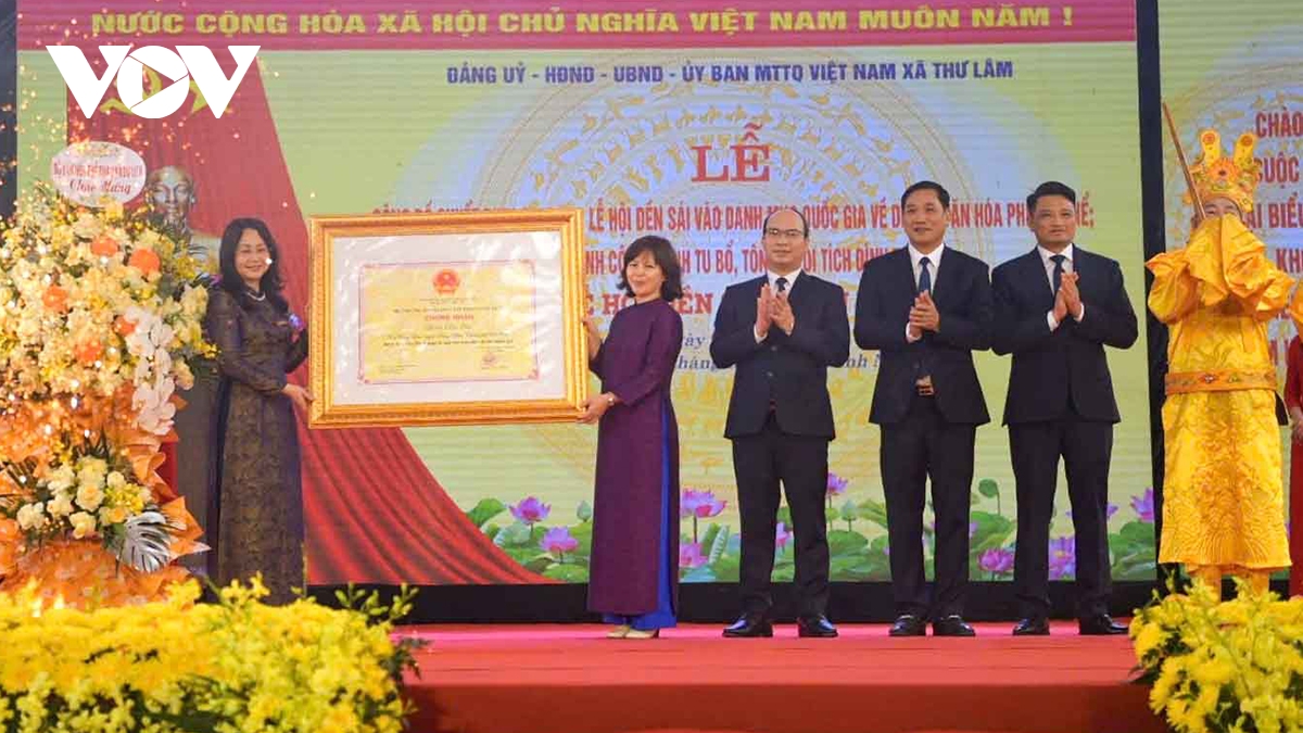 Lãnh đạo Bộ Văn hóa, Thể thao và Du lịch trao Quyết định ghi danh Lễ hội Đền Sái vào Danh mục Di sản văn hóa phi vật thể quốc gia cho đại diện xã Thư Lâm.