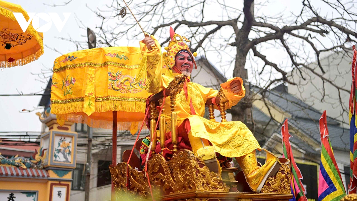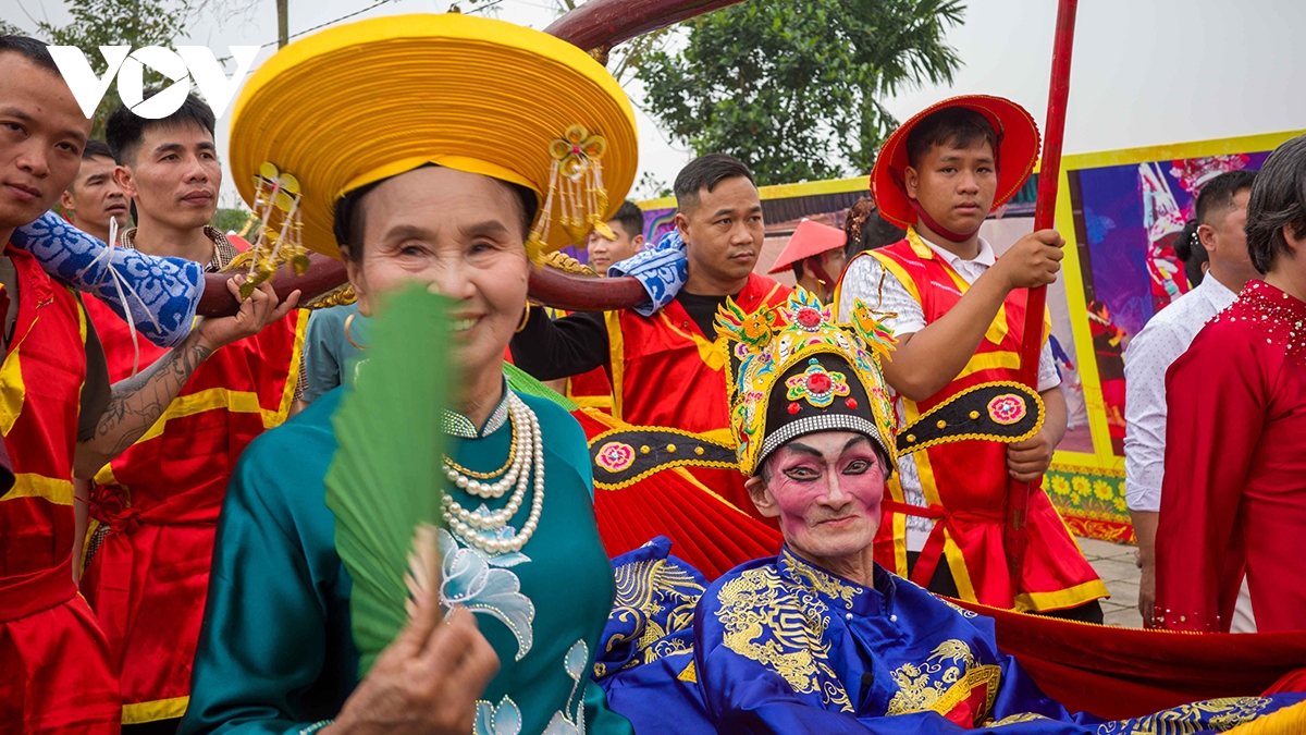 Đoàn rước với đầy đủ các chức danh truyền thống tái hiện nghi thức triều đình xưa.