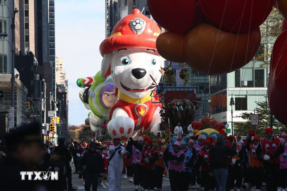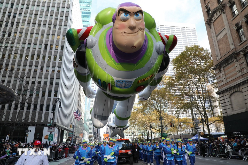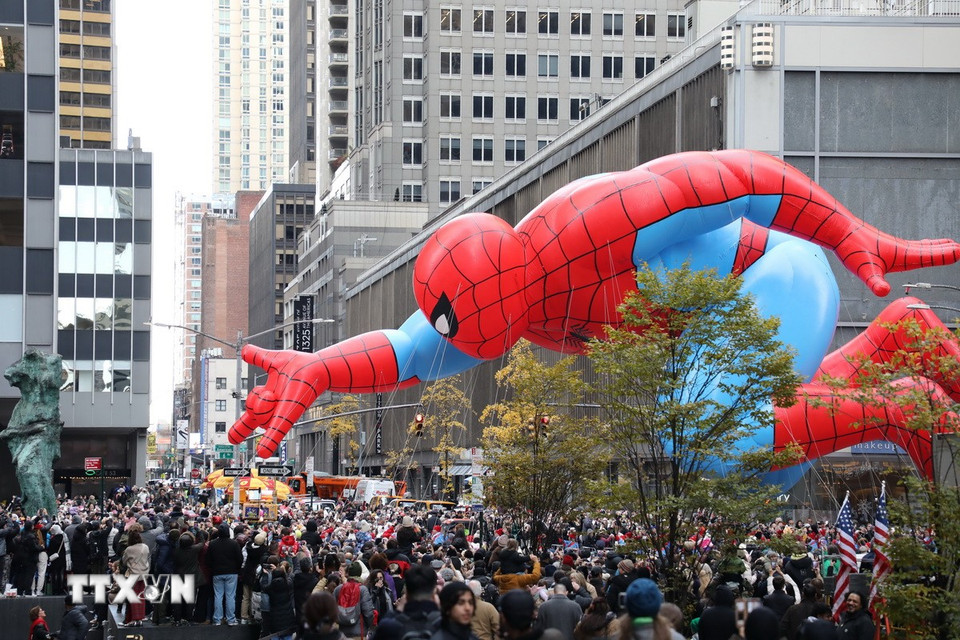 Ngày 27/11/2025, cuộc diễu hành đón ngày lễ Tạ ơn do chuỗi cửa hàng bách hóa lớn Macy’s tổ chức đã mang lại không khí lễ hội rộn ràng cho thành phố New York (Mỹ) khi những quả bóng bay khổng lồ mô phỏng các nhân vật hoạt hình nổi tiếng bay lơ lửng trên bầu trời quận Manhattan trong dịp lễ được mong chờ nhất nước Mỹ. (Ảnh: THX/TTXVN)