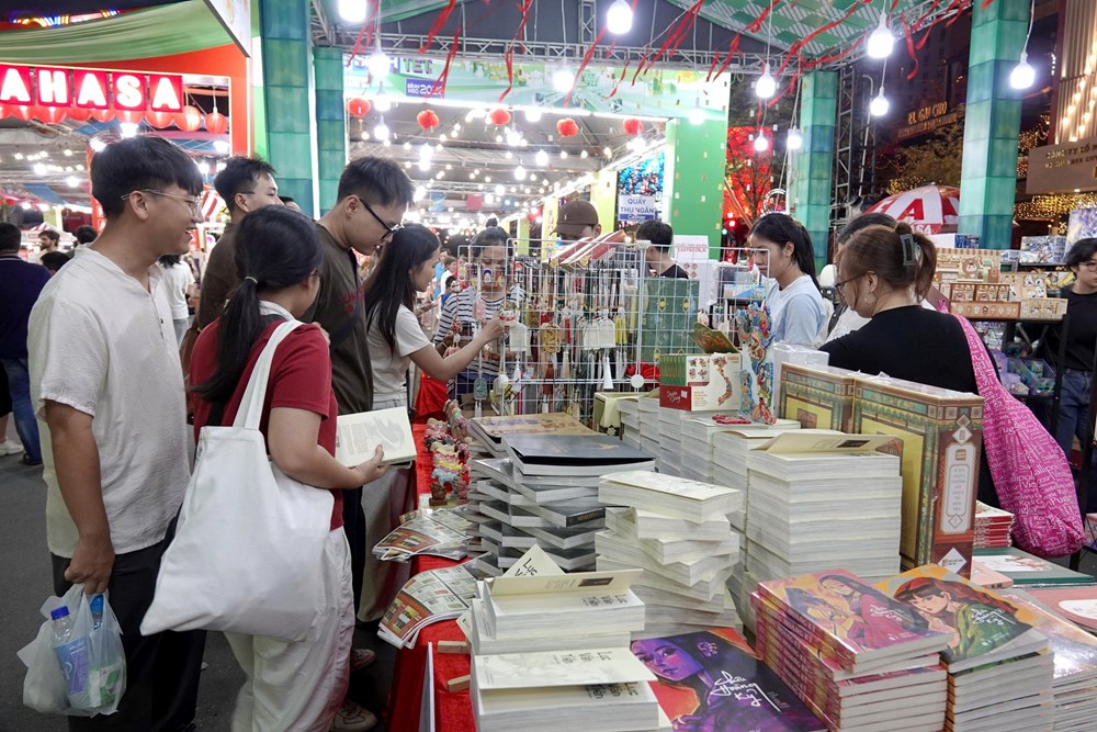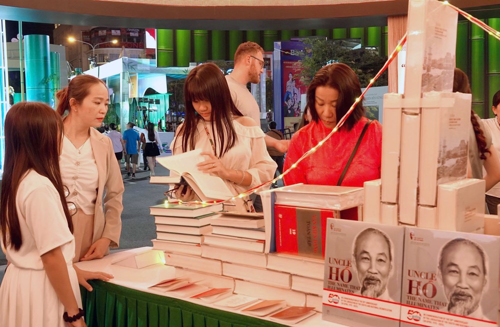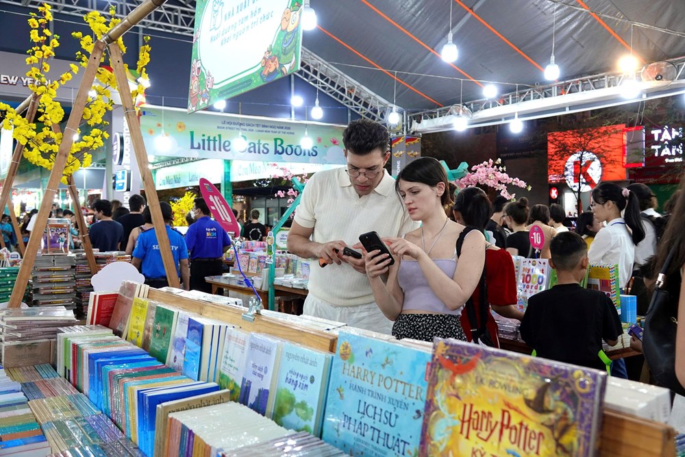 Du khách quốc tế tham quan và mua sách tại sự kiện