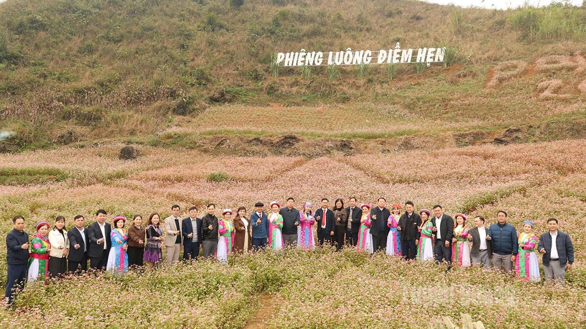 Lãnh đạo các xã lân cận cùng du khách chụp ảnh hoa Tam giác mạch.