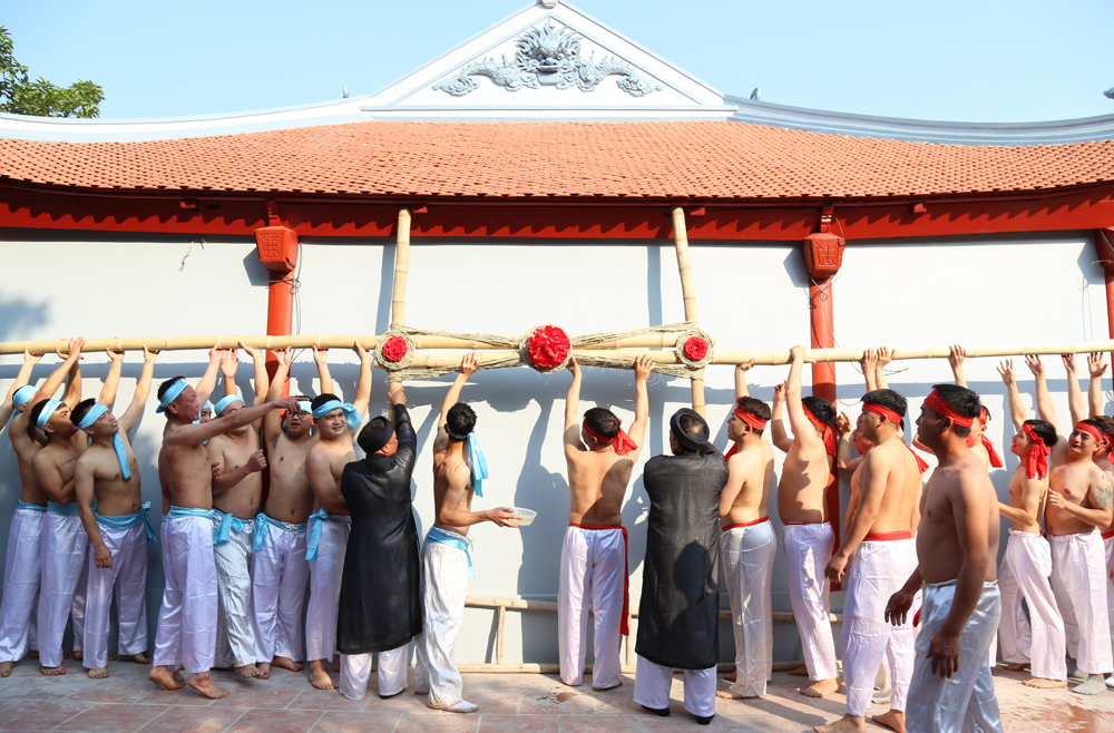 Khi vào hội, 70 trai đinh chia làm hai đội Đông và Tây, mỗi đội 35 người trong trang phục truyền thống, 4 trai đinh to khỏe nhất được chọn đứng đầu đòn gánh, những người còn lại bám vào thân tre chờ hiệu lệnh trống để bước vào ba keo kéo mang ý nghĩa biểu trưng.