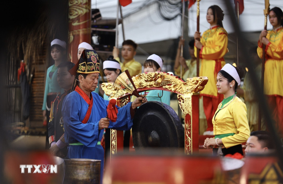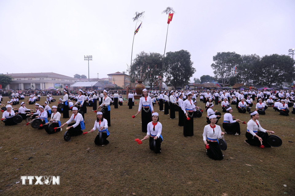 Các nghệ nhân trong trang phục dân tộc trình diễn chiêng Mường tại lễ hội Khai hạ. (Ảnh: Trọng Đạt/TTXVN)