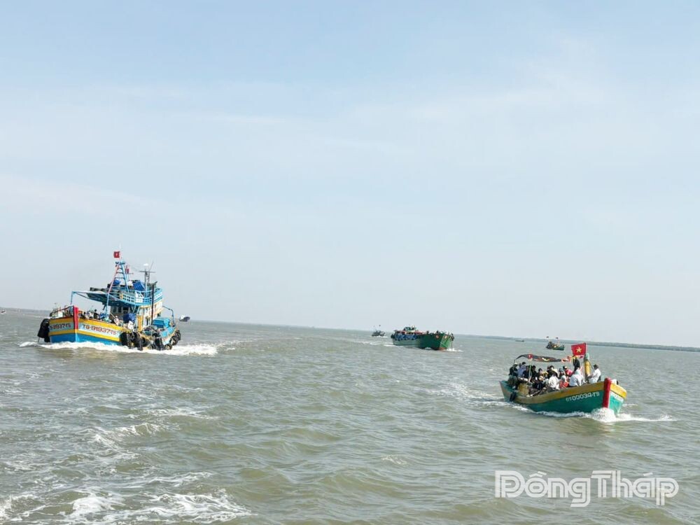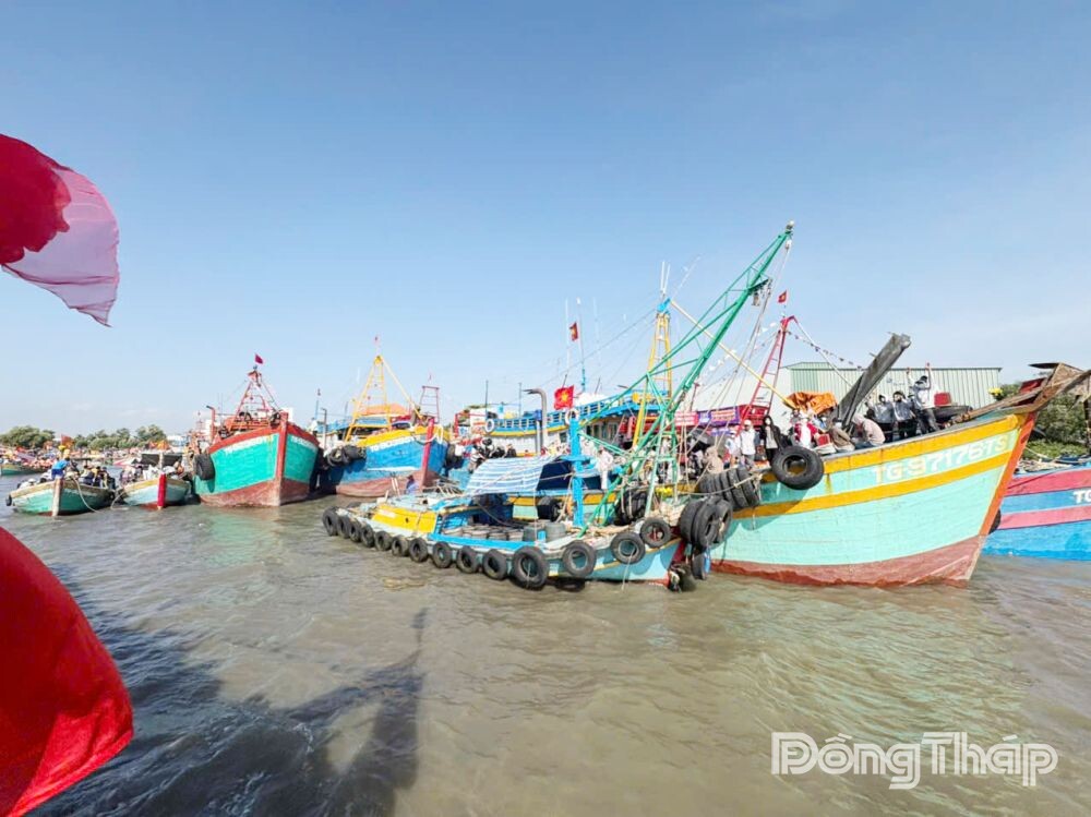 Đoàn tàu thuyền trang hoàng rực rỡ thực hiện nghi lễ rước Cá Ông trên biển tại Vàm Láng.