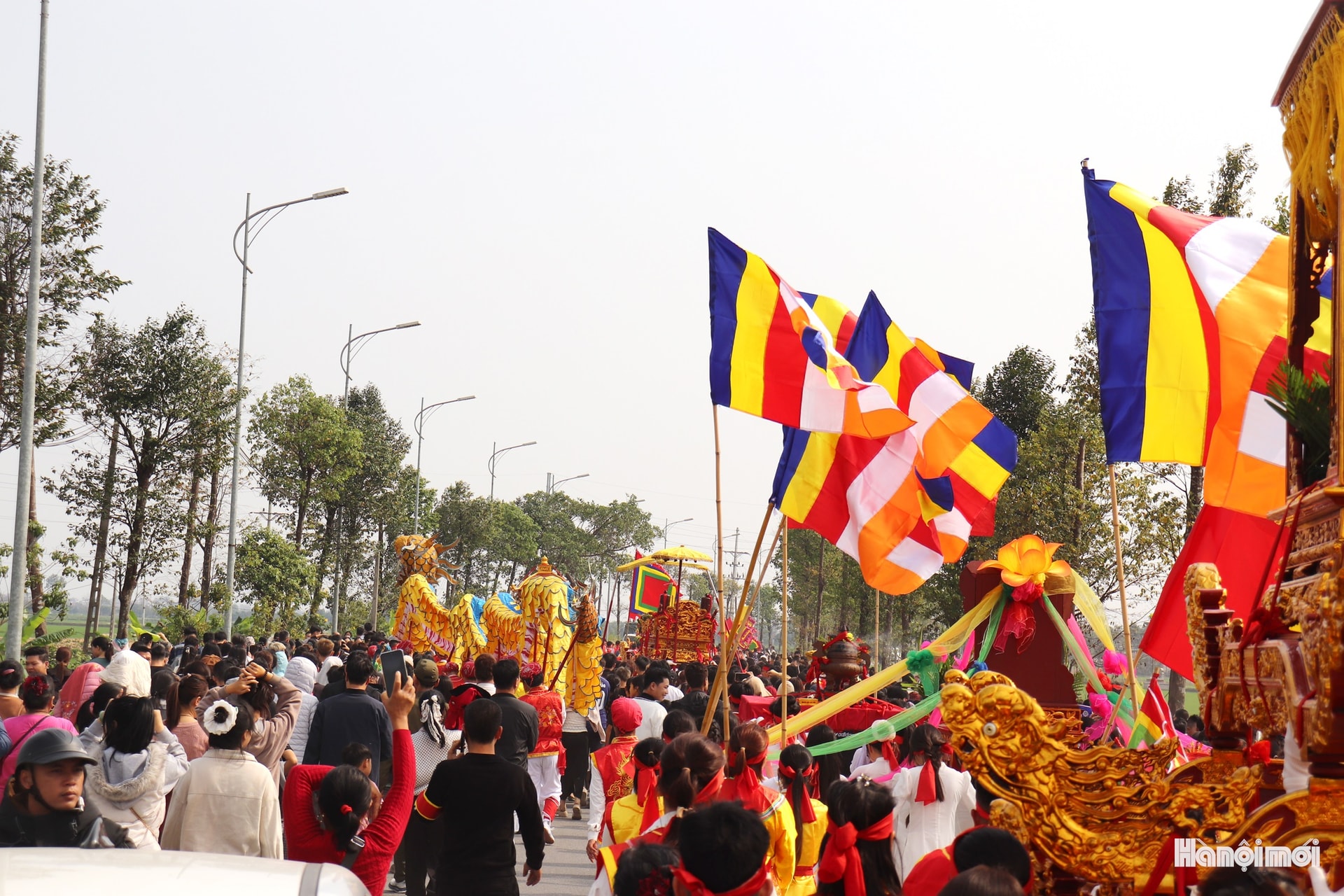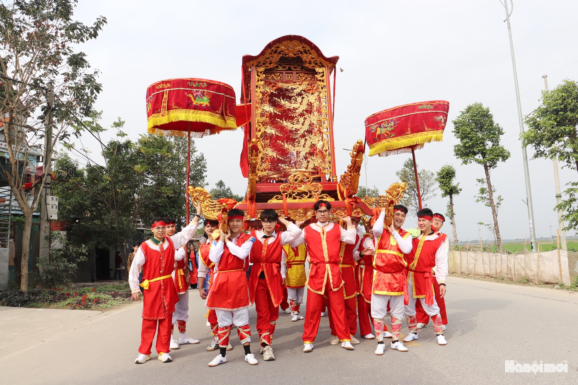 Kiệu Đức Thánh (kiệu Ông) - vị Thành hoàng làng - được rước trọng thể về đình làng Ngọc Động để cử hành nghi lễ tế chính. Toàn bộ trình tự rước phản ánh rõ nét phong tục, tín ngưỡng và trật tự lễ nghi đặc trưng của lễ hội truyền thống Bắc Bộ, vừa trang nghiêm, vừa đậm đà bản sắc văn hóa cộng đồng. Ảnh: Tuấn Điệp